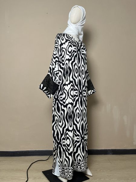 Each piece is delicately embellished with fine diamond-like stones, securely affixed onto the surface. These subtle sparkles reflect light beautifully, giving the kaftan a refined glow without being overpowering — ideal for formal events, exclusive gatherings, or a sophisticated everyday look.